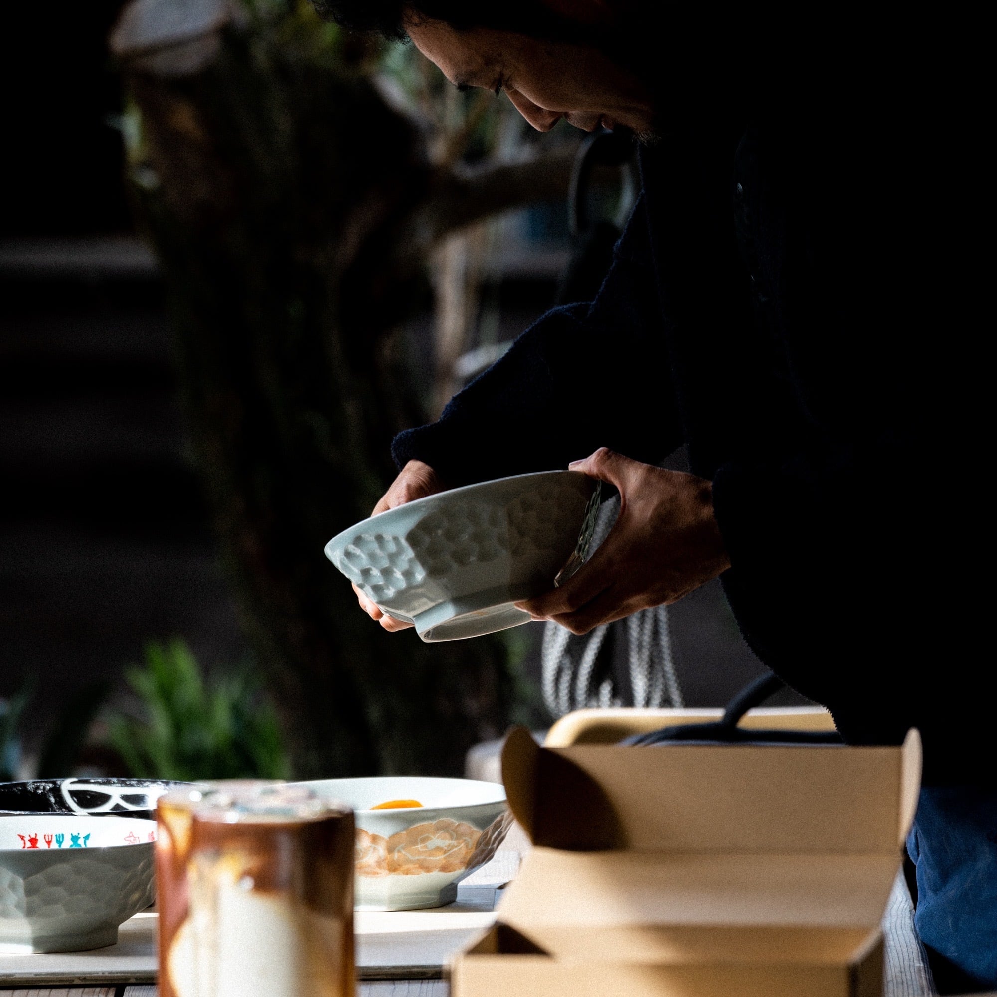 鹿児島の木工アーティスト「アキヒロ ジン」の木彫りの型を使用し、鹿児島の窯元「one kiln」が焼き上げたユニークオリジナルどんぶり。